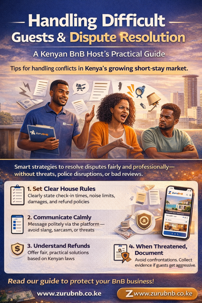 Handling difficult guests and resolving disputes in Kenya’s growing short-stay and BnB market poses both opportunities and responsibilities. While most guests are respectful and appreciative, disputes are inevitable. Noise complaints, unpaid extras, damaged property, overstays, or refund disagreements are common issues that Kenyan hosts face.